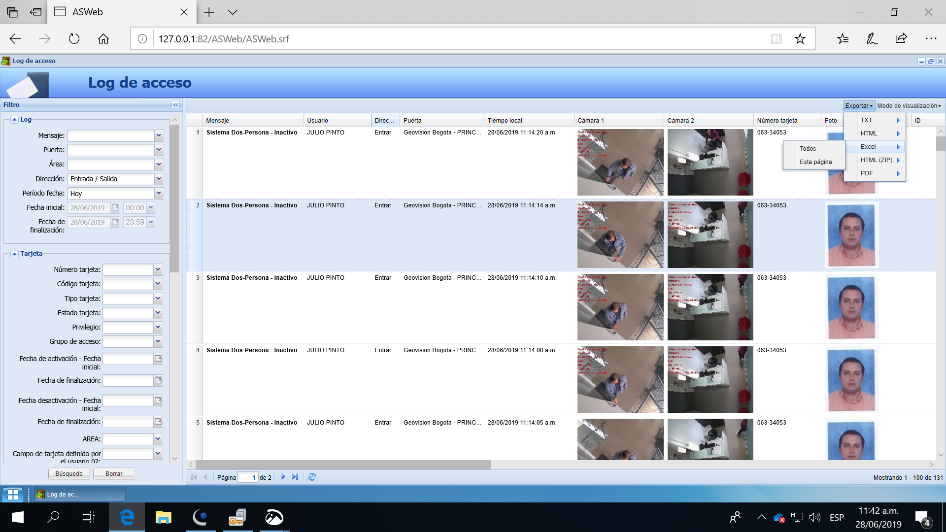 y demás sistemas control de acceso, permite definición de permisos y horarios de acceso, registro fotográfico de 2 cámaras y enlace directo a video grabado de CCTV GeoVision.