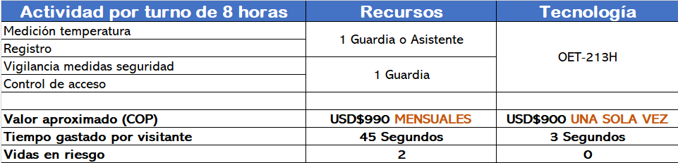 Si bien es cierto que todos los casos son diferentes, un ejercicio de cálculo sencillo como este pude tal vez ayude a darle una visión diferente de lo que puede lograr implementando tecnología de control de acceso, registro, reconocimiento de rostro y medición de temperatura.