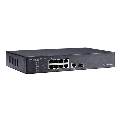 8 puertos 10 / 100BaseTX, PSE plus 2 puertos Gigabit Uplink (1xTP, 1xSFP)